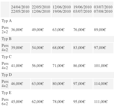 Mindestaufenthalt 1 Woche von Samstag bis Samstag für den Zeitrum vom 12.06.2010 bis 11.09.2010. Mindestaufenthalt 1 Woche mit Ankunft und Abreise nach Wahl zu allen anderen Terminen.